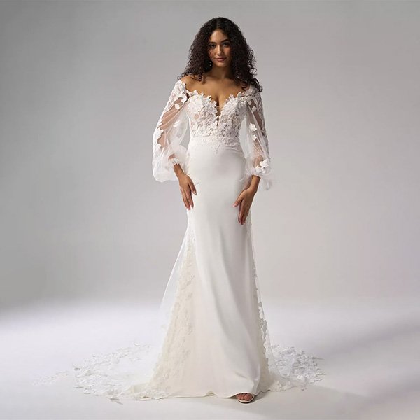 The AW Magnolia features a flattering floor-length hem that flows with every step, ensuring that you radiate grace as you walk down the aisle. The alluring V-neckline frames your décolletage beautifully, while the combination of long sleeves and delicate spaghetti straps creates a captivating silhouette, perfectly balancing modesty with allure.
