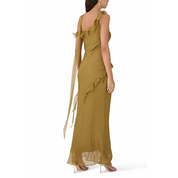 Step into a world of elegance and sophistication with the De La Vali Hemera Maxi Dress—a true masterpiece that redefines femininity and grace. Tailored from the finest 100% silk, this dress envelops you in a luxurious embrace, ensuring you feel as exquisite as you look. The enchanting cascading ruffles, artfully designed along the front and back, create a mesmerizing movement that flows with every step, leaving a trail of awe in your wake.
