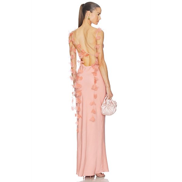 Step into a realm of ethereal beauty with the Cult Gaia (ad) Nymeria Gown in a breathtaking petal pink hue. This exquisite gown transcends the ordinary, enveloping you in luxurious silk and featuring delicate organza flower petals that cascade gracefully down the silhouette, capturing the light with every movement.