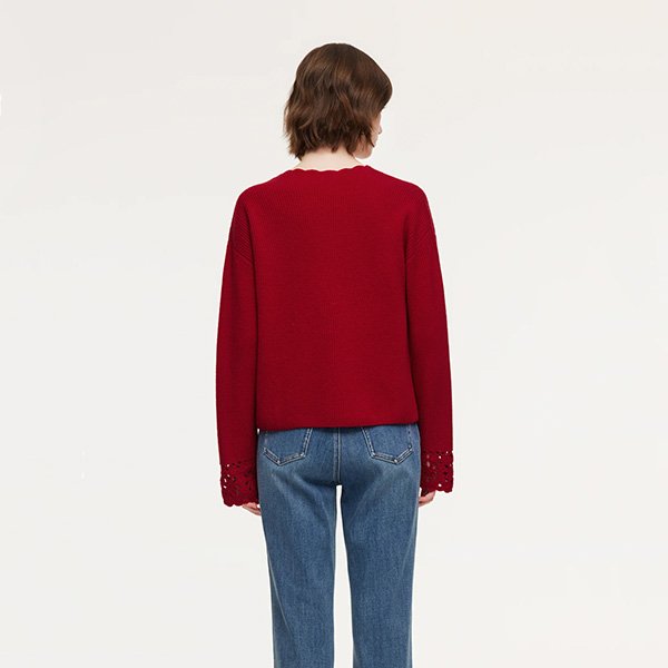 The sweater features hand-crocheted floral details adorning the neckline and cuffs—an exquisite touch that adds a hint of artisanal charm. These delicate embellishments elevate the sweater from a mere wardrobe staple to a statement piece, infusing your outfit with a sense of individuality and grace.