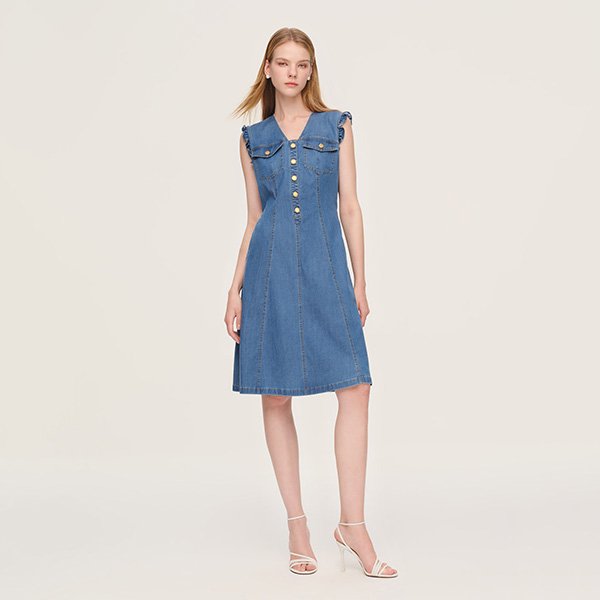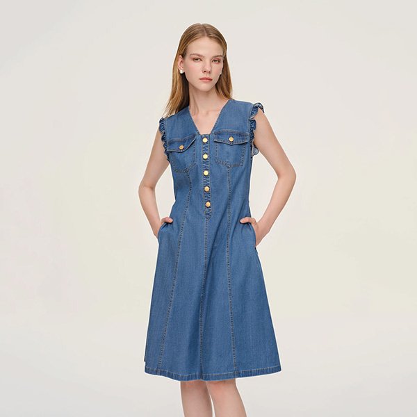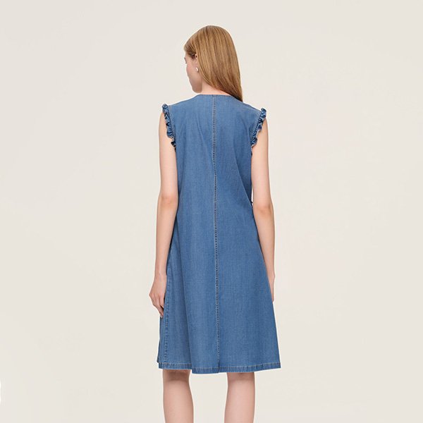 This sleeveless A-line dress is crafted from a stretchy lyocell-blend denim, offering breathable comfort and a flattering fit. Feminine ruffled armholes and a V-neck create a charming silhouette, while functional side pockets add everyday convenience. Perfect for spring and summer, this versatile piece ensures you feel effortlessly stylish and at ease, whether paired with sandals or casual sneakers. Lyocell Blend Denim V-Neck Women Sleeveless Midi Dress GoodsNo: 1F4R4K090 • Fit Type: Fit • Thickness: Moderate Materials Shell: 59%Lyocell 26%Polyester 13%Cotton 2%Elastane Pocket: 100%Cotton Suggest Wash separately Wash inside out,Iron on reverse side only Wash with protective mesh bag Washing • Machine wash cold normal cycle • Do not bleach • Do not tumble dry • Line dry in the shade • Cool iron • Do not dry-clean